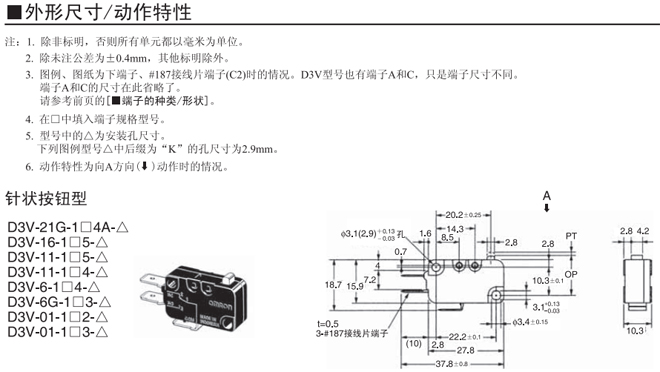 針狀按鈕型 --- 1.23N {125gf} D3V-21G-1□4A-△ D3V-21G-2□4A-△ D3V-21G-3□4A-△
