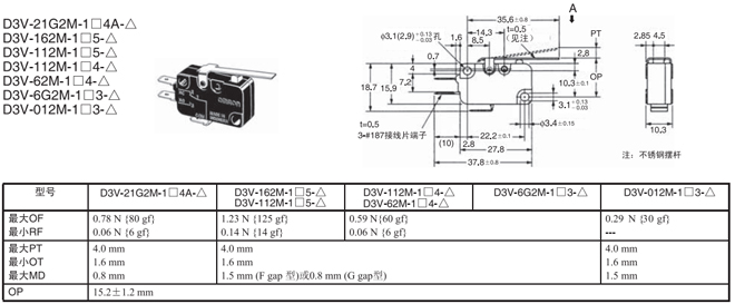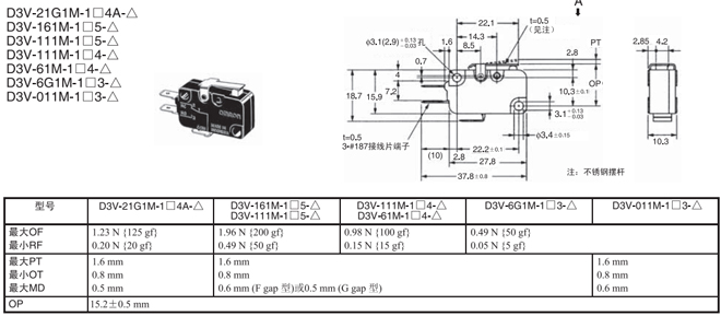 短擺桿型 內部安裝 1.96N {200gf} D3V-161-1□5-△ D3V-161-2□5-△ D3V-161-3□5-△