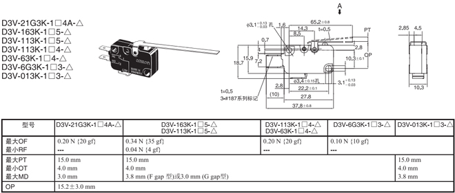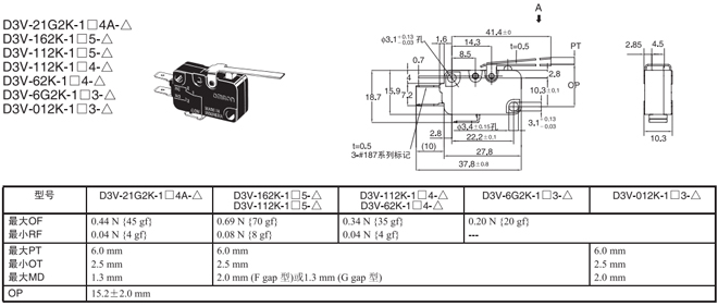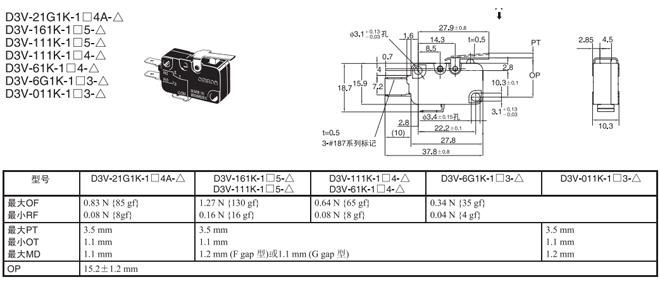 短擺桿型 內部安裝 1.23N {125gf} D3V-21G1-1□4A-△ D3V-21G1-2□4A-△ D3V-21G1-3□4A-△