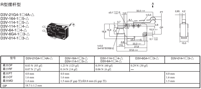 R型擺桿型 內部安裝 0.83N {85gf} D3V-21G4-1□4A-△ D3V-21G4-2□4A-△ D3V-21G4-3□4A-△
